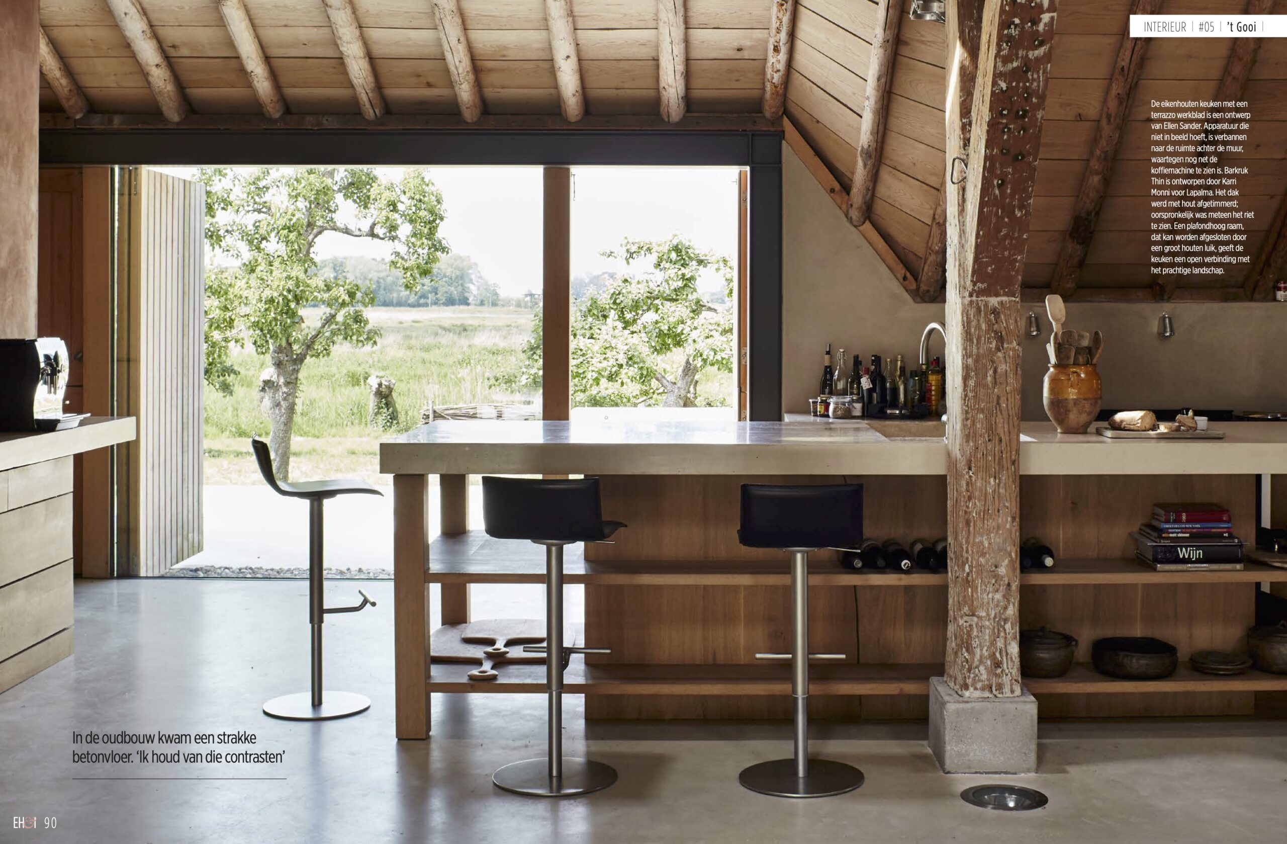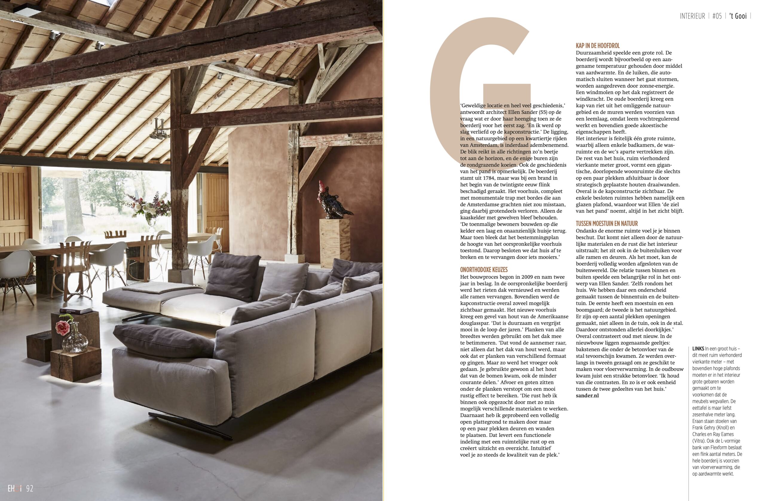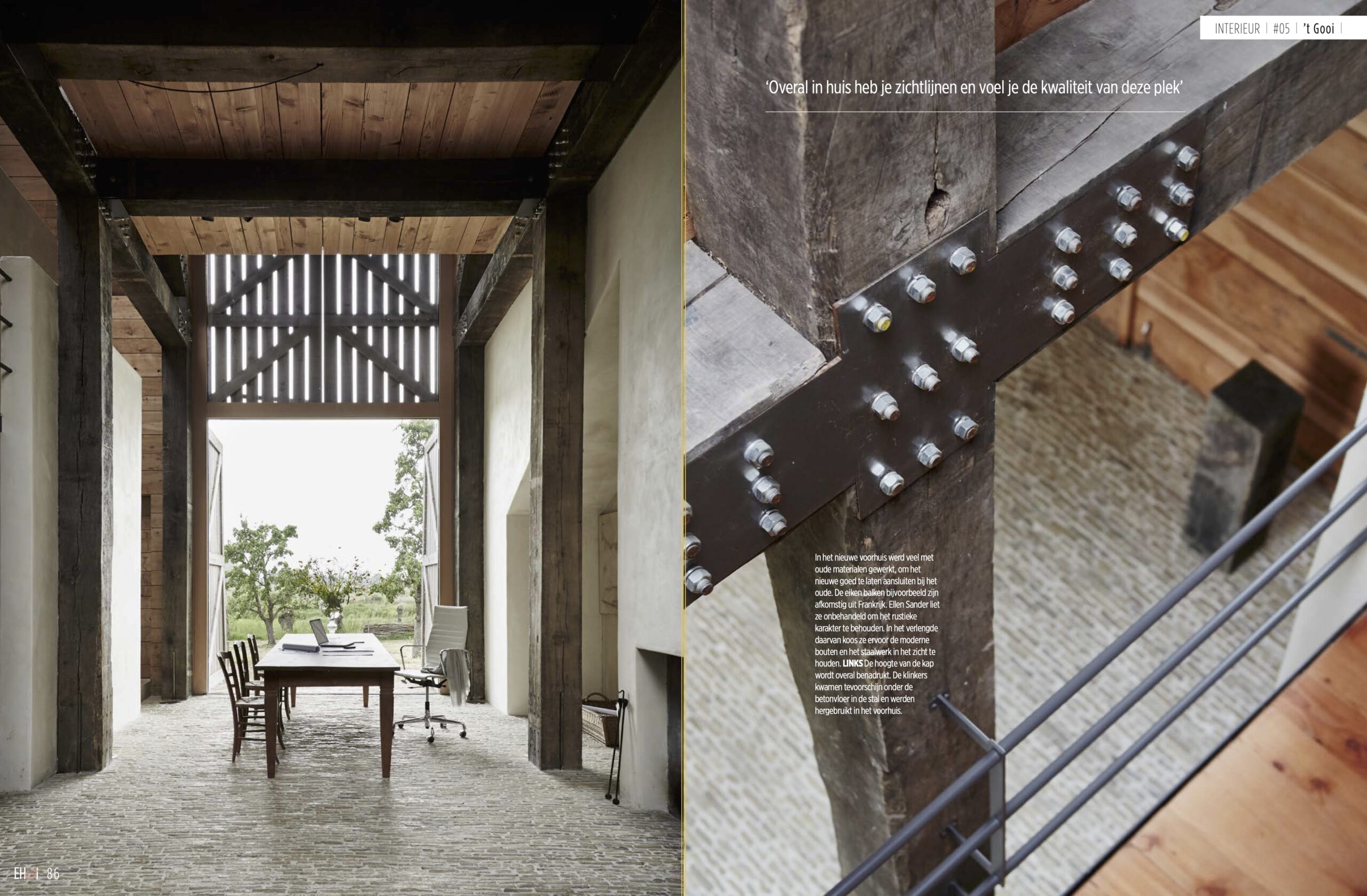 Ondanks de enorme ruimte voel je je binnen beschut. Dat komt niet alleen door de natuurlijke materialen en de rust die het interieur uitstraalt; het zit ook in de buitenluiken voor alle ramen en deuren. Als het moet, kan de boerderij volledig worden afgesloten van de buitenwereld. Die relatie tussen binnen en buiten speelde een belangrijke rol in het ontwerp van Ellen Sander. ‘Zelfs rondom het huis. We hebben daar een onderscheid gemaakt tussen de binnentuin en de buitentuin. De eerste heeft een moestuin en een boomgaard; de tweede is het natuurgebied. Er zijn op een aantal plekken openingen gemaakt, niet alleen in de tuin, ook in de stal. Daardoor ontstonden allerlei doorkijkjes.’Overal contrasteert oud met nieuw. In de nieuwbouw liggen zogenaamde geeltjes: bakstenen die onder de betonvloer van de stal tevoorschijn kwamen. Ze werden overlangs in tweeën gezaagd om ze geschikt te maken voor vloerverwarming. In de oudbouw kwam juist een strakke betonvloer. ‘Ik houd van die contrasten. En zo is er ook eenheid tussen de twee gedeeltes van het huis.’