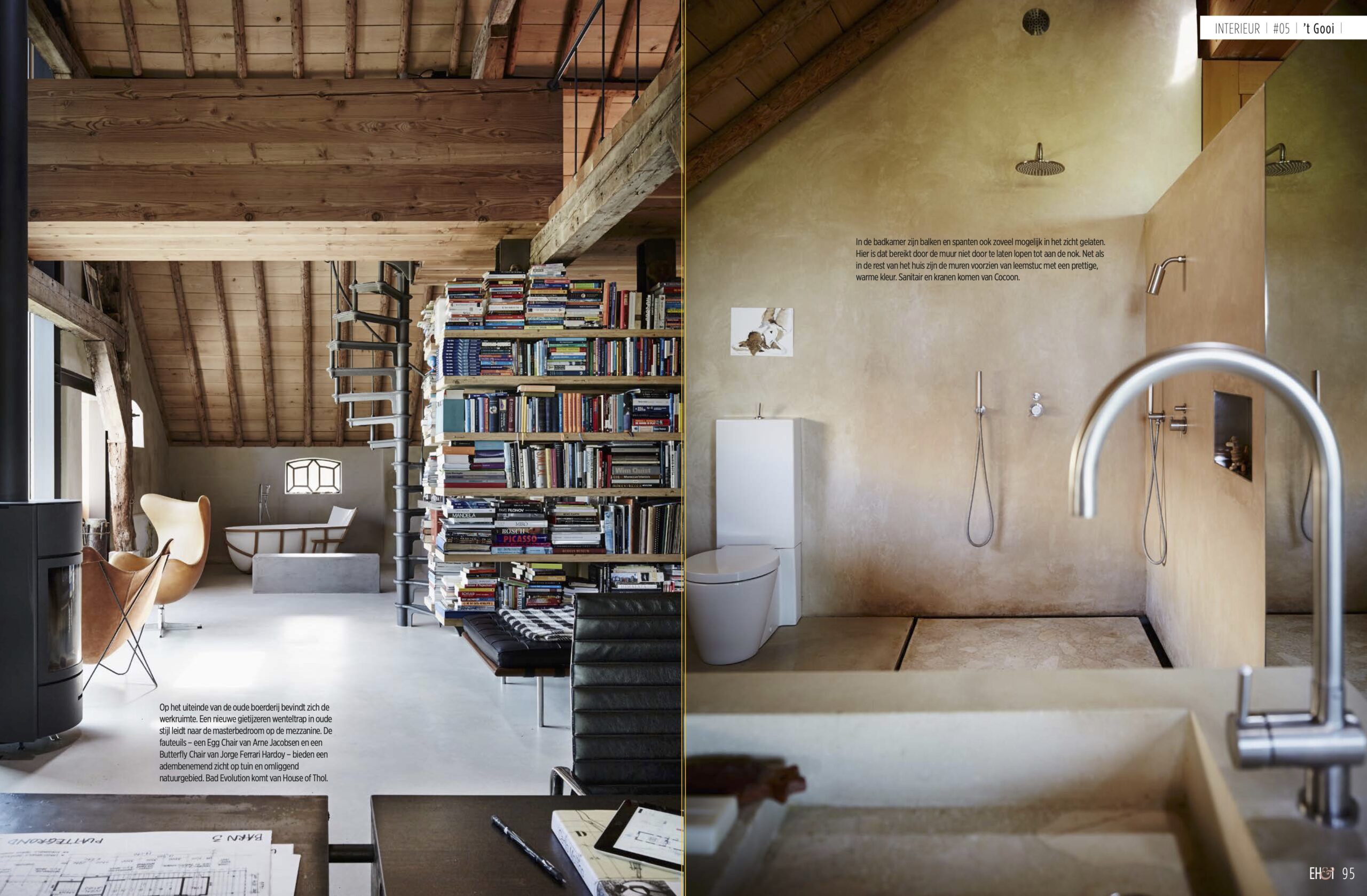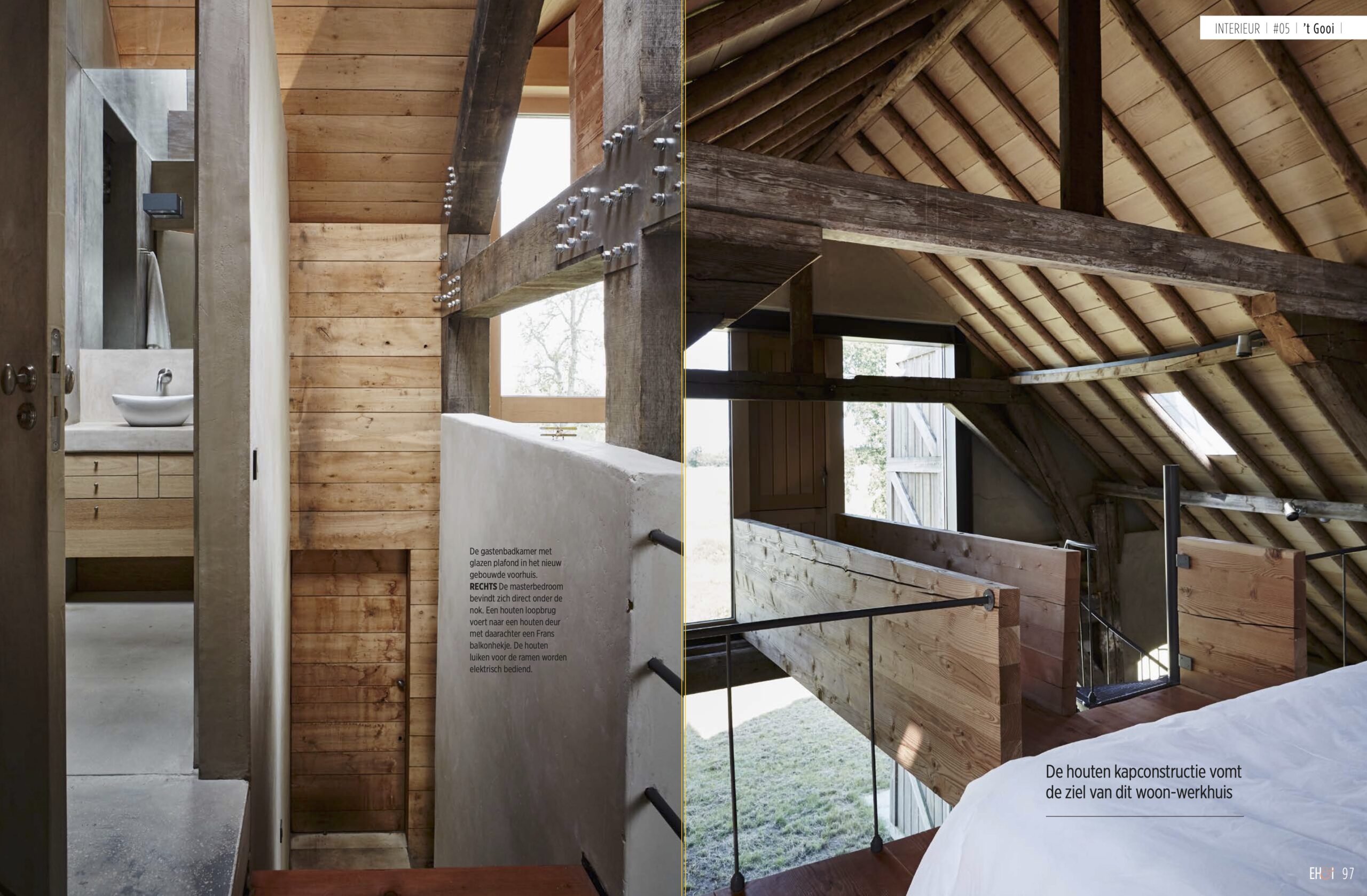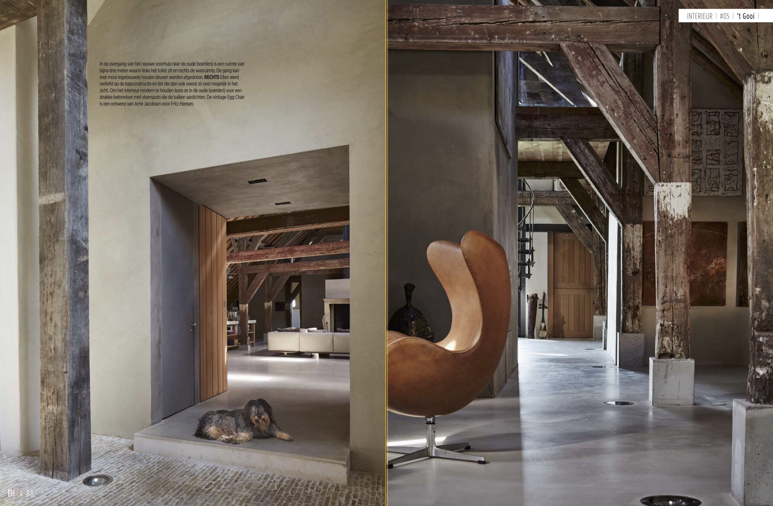 Ondanks de enorme ruimte voel je je binnen beschut. Dat komt niet alleen door de natuurlijke materialen en de rust die het interieur uitstraalt; het zit ook in de buitenluiken voor alle ramen en deuren. Als het moet, kan de boerderij volledig worden afgesloten van de buitenwereld. Die relatie tussen binnen en buiten speelde een belangrijke rol in het ontwerp van Ellen Sander. ‘Zelfs rondom het huis. We hebben daar een onderscheid gemaakt tussen de binnentuin en de buitentuin. De eerste heeft een moestuin en een boomgaard; de tweede is het natuurgebied. Er zijn op een aantal plekken openingen gemaakt, niet alleen in de tuin, ook in de stal. Daardoor ontstonden allerlei doorkijkjes.’Overal contrasteert oud met nieuw. In de nieuwbouw liggen zogenaamde geeltjes: bakstenen die onder de betonvloer van de stal tevoorschijn kwamen. Ze werden overlangs in tweeën gezaagd om ze geschikt te maken voor vloerverwarming. In de oudbouw kwam juist een strakke betonvloer. ‘Ik houd van die contrasten. En zo is er ook eenheid tussen de twee gedeeltes van het huis.’
