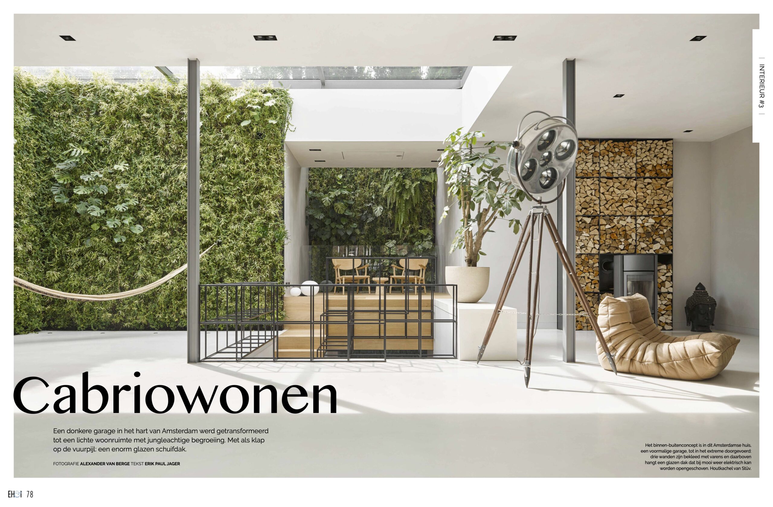 Een donkere garage in het hart van Amsterdam werd getransformeerd tot een lichte woonruimte met jungleachtige begroeiing. Met als klap op de vuurpijl: een enorm glazen schuifdak