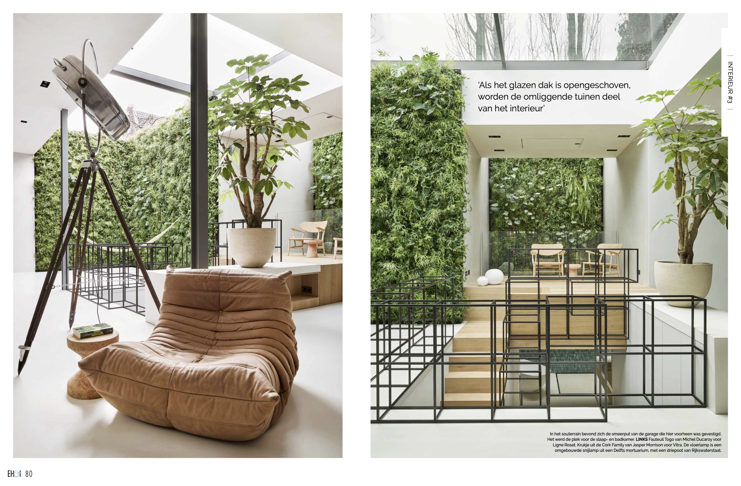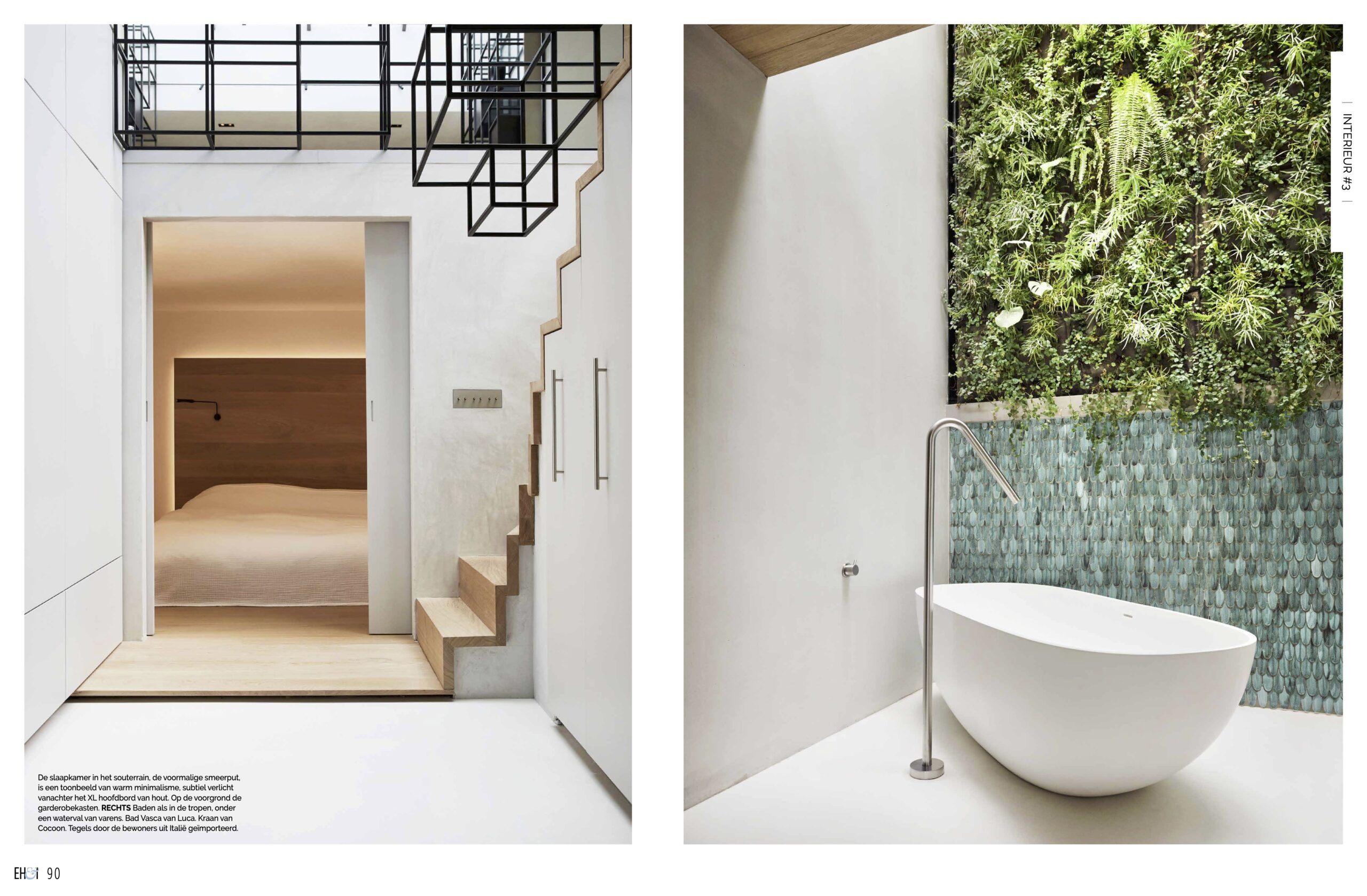 Het buitengevoel wordt nog versterkt doordat de wanden rondom het glasdak begroeid zijn met diverse soorten varens. ‘De techniek erachter is bijzonder. De groenwand heeft een voedingswand achter de planten waar continu water doorheen druppelt. Dat wordt opgevangen in een bak onder de wand. Alle techniek hebben we onzichtbaar weggewerkt; de opvangbak zit onder de afwerkvloer. Hierdoor lijkt het groen op natuurlijke wijze vanaf de grond tot uit het glasdak te groeien.’ Op de plek van de voormalige smeerput, nu in gebruik als slaapkamer en badkamer, loopt de groenwand door naar beneden, waardoor de varenmuur zelfs twee verdiepingen beslaat. ‘Als je daar staat te douchen en omhoogkijkt, waan je je in de jungle.’