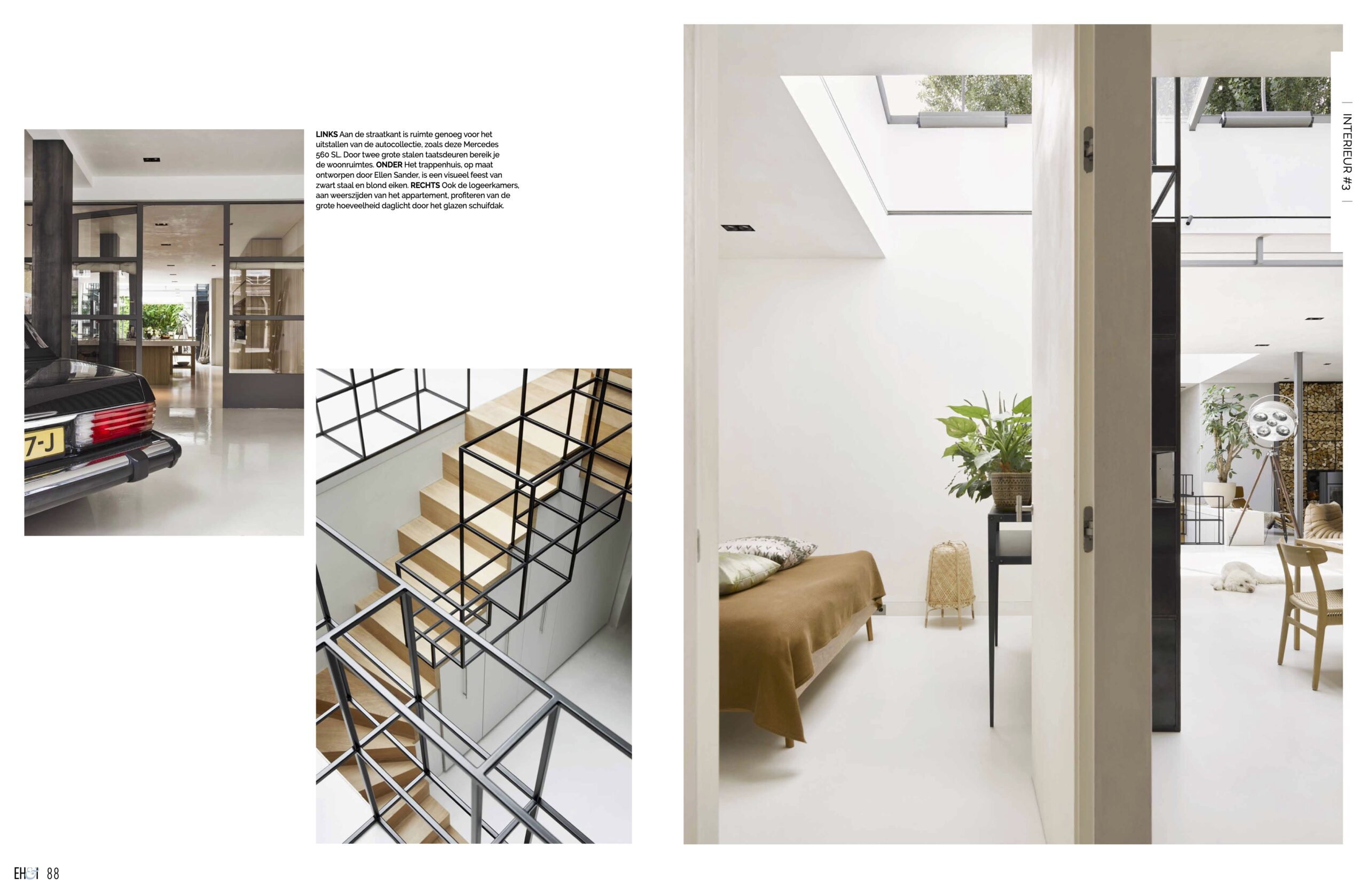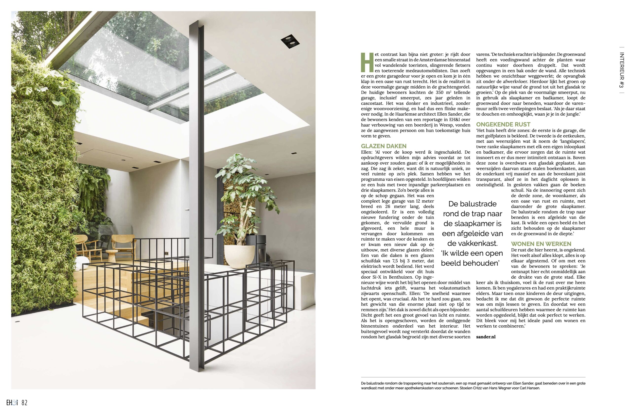 Het contrast kan bijna niet groter: je rijdt door een smalle straat in de Amsterdamse binnenstad vol wandelende toeristen, slingerende fietsers en toeterende medeautomobilisten. Dan zoeft er een grote garagedeur voor je open en kom je in één klap in een oase van rust terecht. Het is de realiteit in deze voormalige garage midden in de grachtengordel. De huidige bewoners kochten de 350 m2 tellende garage, inclusief smeerput, zes jaar geleden in cascostaat. Het was donker en industrieel, zonder enige woonvoorziening, en had dus een flinke makeover nodig. In de Haarlemse architect Ellen Sander, die de bewoners kenden van een reportage in EH&I over haar verbouwing van een boerderij in Weesp, vonden ze de aangewezen persoon om hun toekomstige huis vorm te geven.